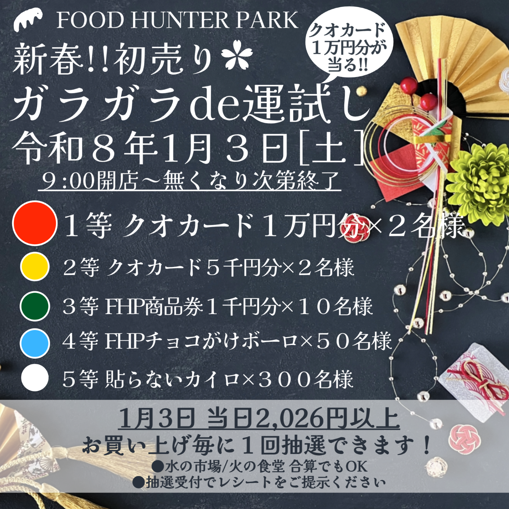 1/2(金)はAOZORA ICE PARKのみ営業中(予約優先)水の市場、火の食堂を含めて全体の営業開始は1/3(土)からとなります。(※火の食堂のメニューは年始の仕入れの関係上、一部メニューを限定しての販売となります。あらかじめご了承くださいませ。)2026福袋やガラガラ抽選会をアイススケートと一緒にぜひ、お楽しみくださいませ♪ 【詳細はこちらから】