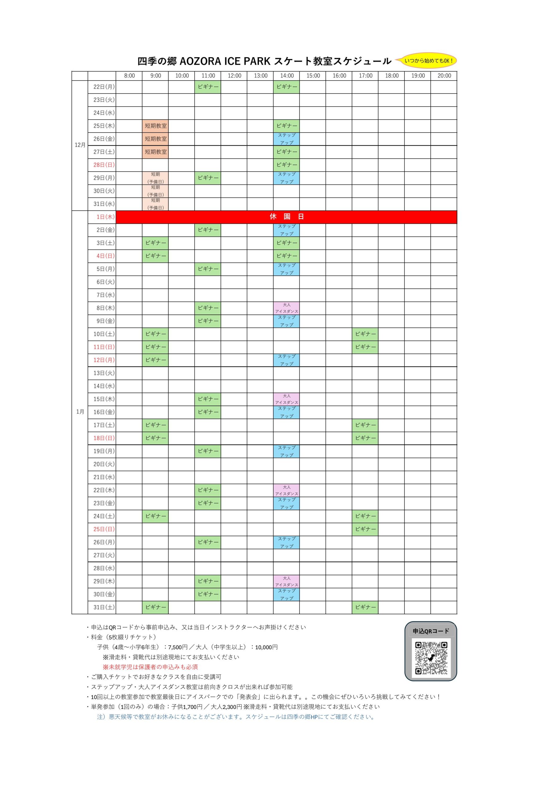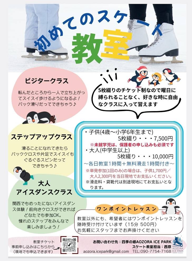 2025.12.08 Special Contents AOZORA ICE PARK ★AOZORA ICE PARK スケート教室開催のご案内★ 初心者でも安心のスケート&アイスホッケー教室を 期間限定で開催いたします♪(^^)/ この貴重な機会に四季の郷公園で スケートの楽しさを学びましょう!! 詳しくはチラシ&下記をご参照くださいませ!! ●AOZORA ICE PARK 先生のご紹介 ●教室のスケジュール(カレンダー)はこちら! ※各教室の詳細についてはこちらをご覧ください! ●通常教室チケット事前お申込はこちら! ●3日間短期教室お申込はこちら! ●こどもアイスホッケー教室お申込みはこちら!