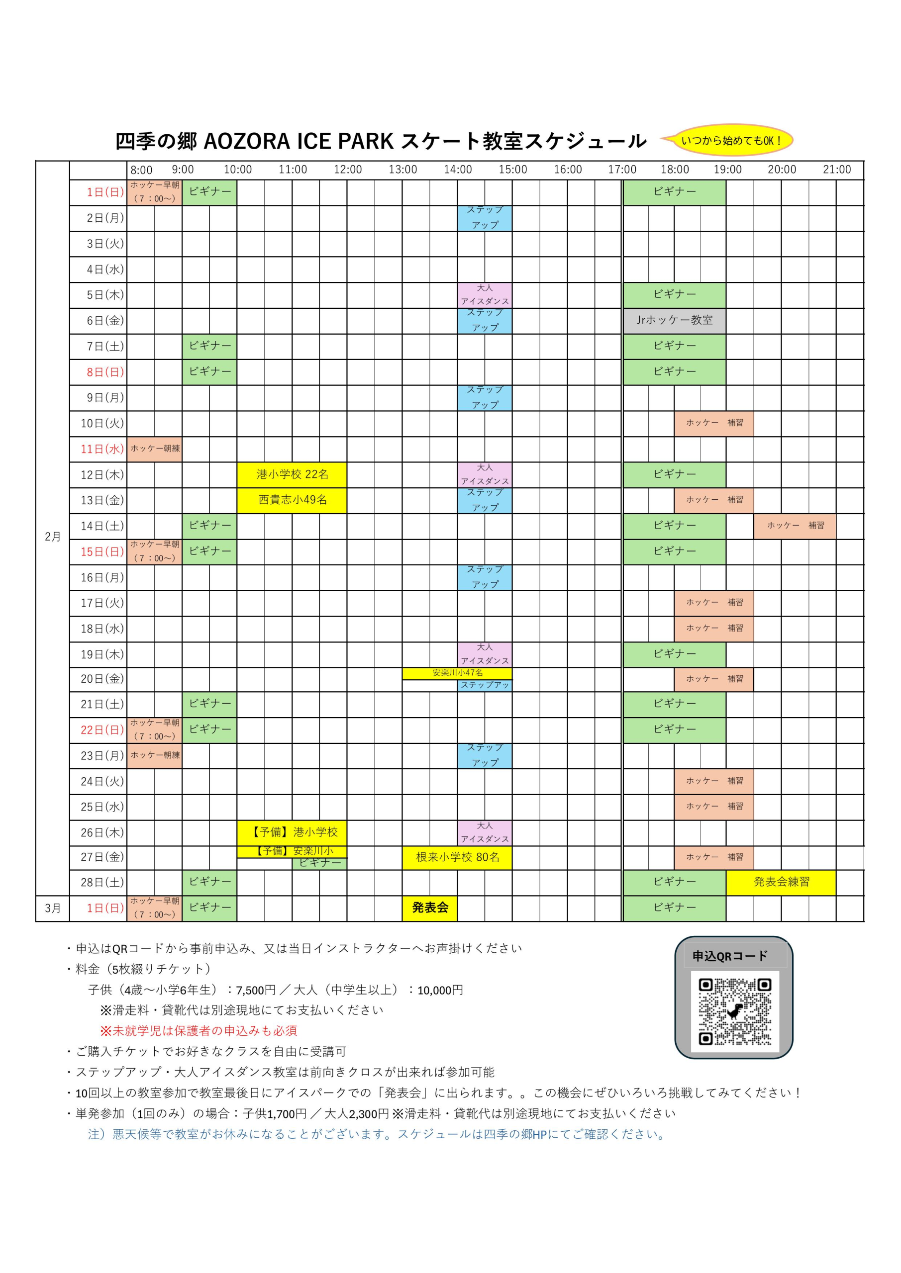2026.01.08 Special Contents AOZORA ICE PARK 【1/30更新】アイススケート教室のスケジュールが一部変更となりました!! 2月の「アイススケート教室」及び「ホッケー教室」について 一部スケジュールを変更させていただきました。 ※発表会の回数を減らしております。 下記のものが最新となりますのでご確認くださいませ。 ≪アイススケート教室の事前お申込みはこちらから≫ ≪アイスホッケー教室の事前お申込みはこちらから≫